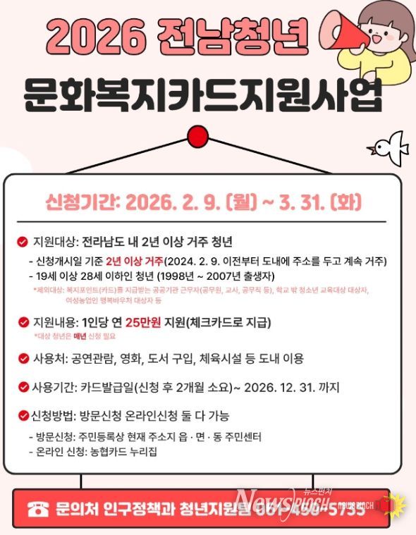 뉴스펀치 최영남 기자 | 무안군은 청년의 문화생활과 자기계발을 지원하기 위해 ‘2026년 전남 청년 문화복지카드 지원사업’ 대상자를 모집하고 있다고 밝혔다.