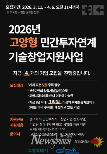 뉴스펀치 박상훈 기자 | 고양산업진흥원이 유망 기술창업기업의 투자 유치와 기술 고도화를 지원하기 위한 ‘2026년 고양형 민간투자연계 기술창업지원사업’에 참여할 창업기업을 모집한다.