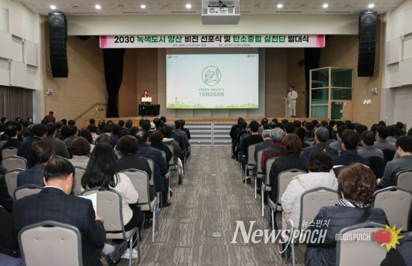 뉴스펀치 박세훈 기자 | 양산시는 2026년 3월 12일 양산비즈니스센터 컨벤션홀에서 '2030 녹색도시 양산' 비전 선포식과 탄소중립 실천단 발대식을 개최하고, 지속가능한 녹색도시로의 본격적인 전환을 공식 선언했다.