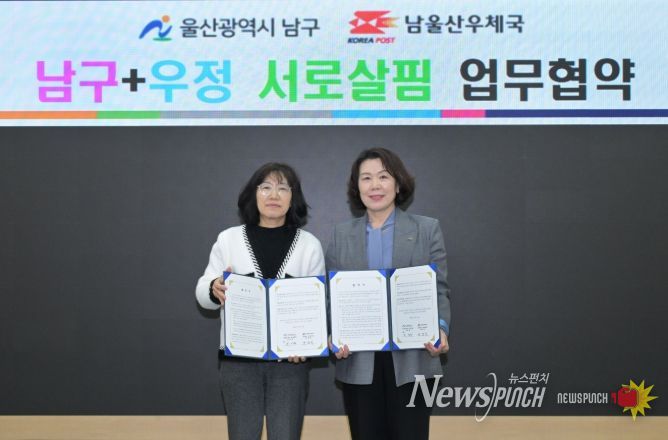 뉴스펀치 김윤걸 기자 | 울산 남구는 12일 구청 3층 소회의실에서 사회적 고립과 위기가구 증가에 대응하고 고독사를 예방하기 위해 남울산우체국과 ‘남구+우정 서로살핌’ 업무협약을 체결했다.