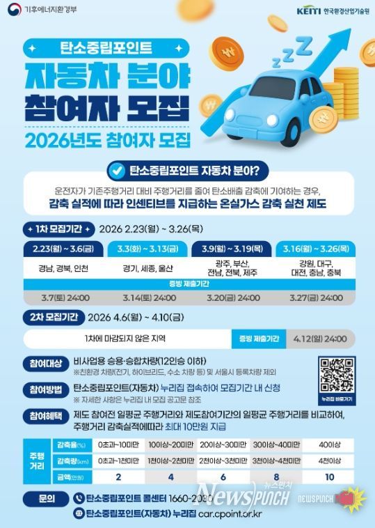 뉴스펀치 조평훈 기자 | 강릉시가 탄소중립 실현을 위해 2026년 탄소중립포인트제 자동차 분야 참여자 640명을 선착순으로 모집한다.