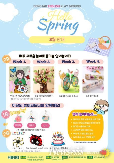 동작어린이영어놀이터에서는 3월 3일부터 31일까지 ‘헬로 스프링(Hello Spring)’을 주제로 영유아 및 초등 저학년을 위한 테마활동과 원데이 클래스를 선보인다.