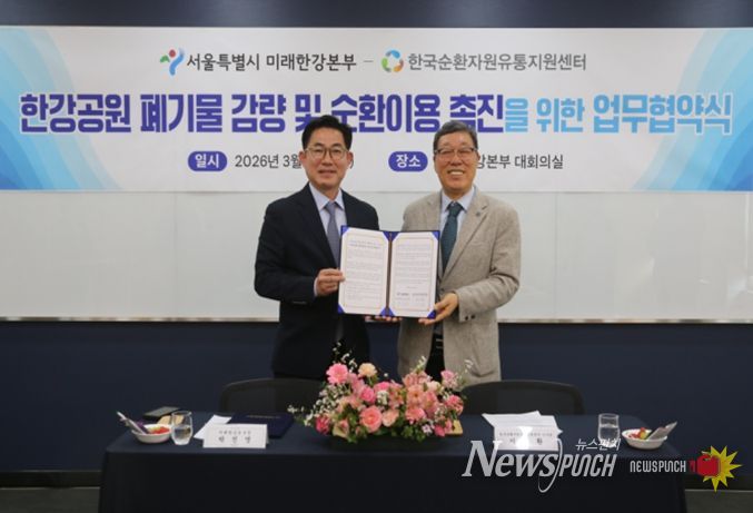 뉴스펀치 박상훈 기자 | 서울시 미래한강본부가 12일 한강공원 내 폐기물 감량 및 순환이용 촉진을 위해 폐기물 재활용 분야 전문기관인 한국순환자원유통지원센터(KOrea Resource circulation service Agency, KORA)와 업무협약을 체결했다.