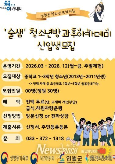 뉴스펀치 조평훈 기자 | 영월군 주천면에 위치한 영월군청소년문화의집이 ‘술샘’ 청소년방과후아카데미에 참여할 청소년을 모집한다.