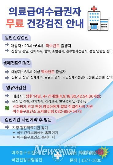 뉴스펀치 정홍균 기자 | 인천 미추홀구가 의료 취약계층의 질환을 조기에 발견하고 건강 증진을 도모하기 위해 ‘의료급여 수급권자 일반·영유아 건강검진 수검’을 적극 독려하고 있다.