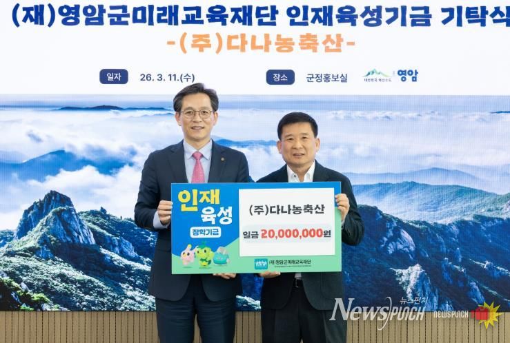 뉴스펀치 김용희 기자 | 김종섭 ㈜다나농축산 대표가 11일 (재)영암군미래교육재단에 인재육성기금 2,000만원을 지정 기부했다.