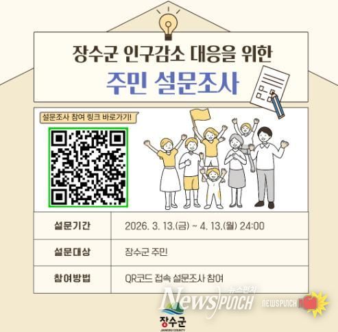 뉴스펀치 정홍균 기자 | 장수군은 인구감소에 선제적으로 대응하고 군민의 삶의 질 향상을 위한 종합 인구정책 수립을 위해 주민 설문조사를 실시한다고 16일 밝혔다.
