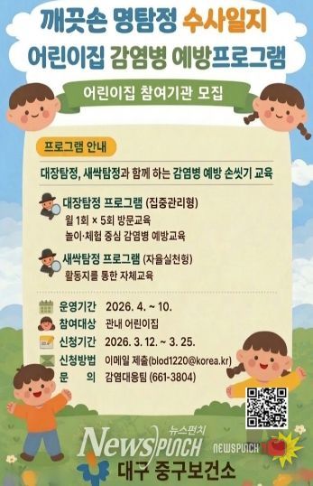 뉴스펀치 조평훈 기자 | 대구 중구보건소(소장 황석선)는 영유아의 올바른 손씻기 습관 형성과 감염병 예방 인식 향상을 위해 어린이집 대상 교육 프로그램 ‘깨끗손 명탐정 세균 수사일지’를 운영한다.