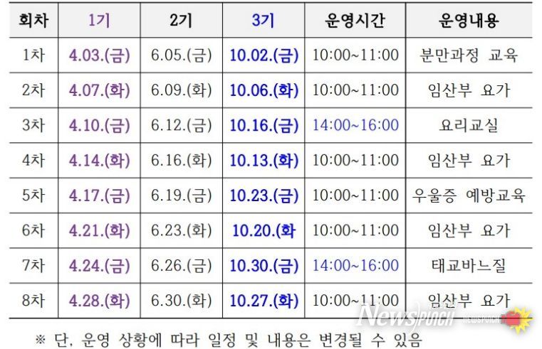 프로그램은 임산부 요가교실을 비롯해 분만 과정 이해, 이유식 만들기, 태교 바느질, 산전·산후 우울증 예방 교육 등 전문가 특강으로 구성된다.