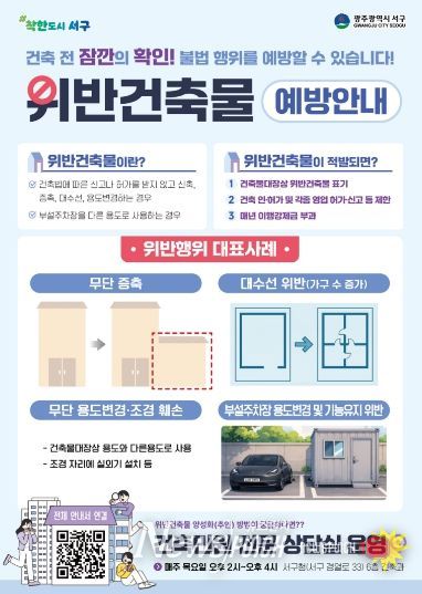 뉴스펀치 김용희 기자 | 광주광역시 서구는 광주 자치구 중 최초로 QR코드를 활용한 ‘전자 위반건축물 예방 사례집’을 제작·배포한다고 16일 밝혔다.