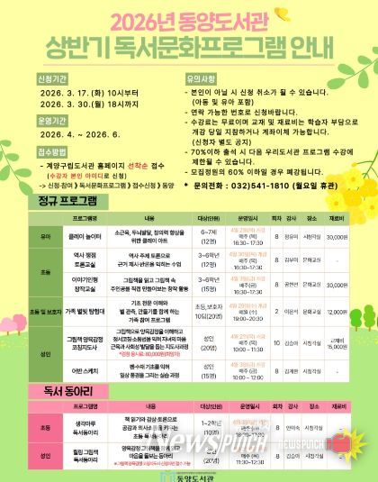 뉴스펀치 정홍균 기자 | (재)인천광역시계양구인재양성교육재단 동양도서관은 지역주민을 대상으로 2026년 상반기 독서문화프로그램 운영을 위한 수강생을 모집한다고 밝혔다.