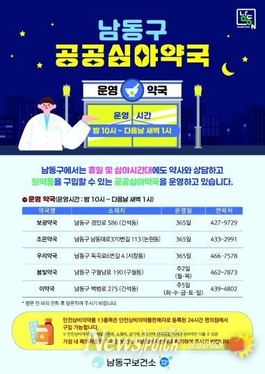 뉴스펀치 정홍균 기자 | 인천시 남동구가 심야시간대 의약품 구입 불편을 해소하고, 안전하고 편리한 공공보건의료 서비스를 제공하기 위해 ‘공공심야약국’을 운영한다고 16일 밝혔다.