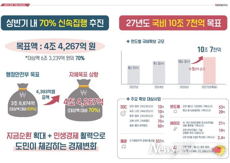 뉴스펀치 조평훈 기자 | 강원특별자치도는 민생경제 활력을 위해 상반기 내 신속집행 대상 예산액의 70%인 4조 4,267억 원을 집행하고 2027년도 국비는 10조 7,000억 원 확보를 함께 추진해 나갈 계획을 밝혔다.