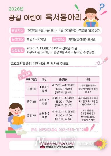 뉴스펀치 정홍균 기자 | 인천광역시교육청서구도서관은 오는 17일부터 어린이 독서동아리 ‘꿈길’에 참여할 관내 초등학생을 모집한다.