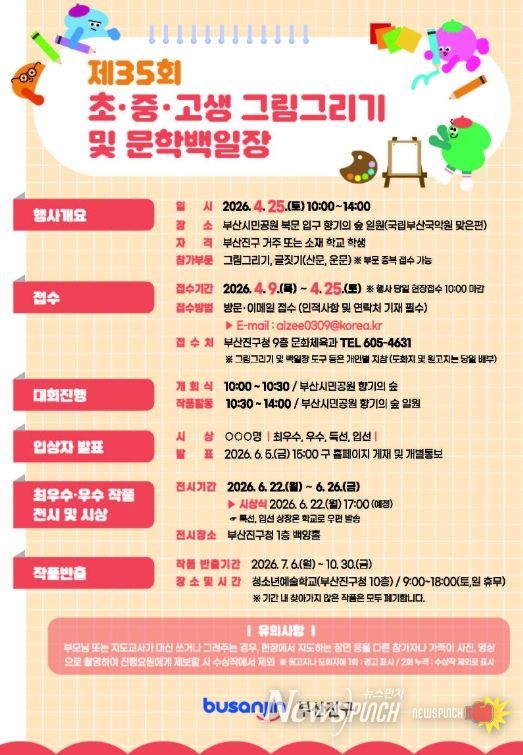 뉴스펀치 김윤걸 기자 | 부산진구는 오는 4월 25일 오전 10시 부산시민공원 향기의 숲 일원에서‘제35회 초·중·고생 그림그리기 및 문학백일장’을 개최한다.