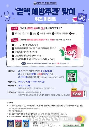 뉴스펀치 조평훈 기자 | 대구광역시 감염병관리지원단은 ‘제16회 결핵예방의 날’(3.24.)과 ‘결핵 예방주간’(3.22.~28.)을 맞아 시민들의 결핵 예방 인식을 높이기 위한 온라인 퀴즈 이벤트를 개최한다.