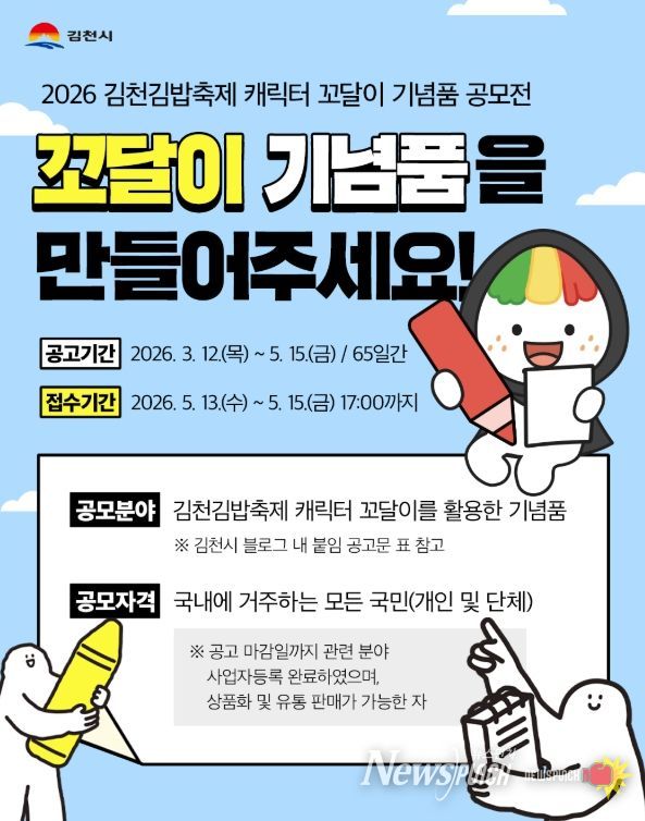 뉴스펀치 박세훈 기자 | 김천시는 김천김밥축제 캐릭터 ‘꼬달이’의 활성화와 창의적인 기념품 발굴을 위해 '2026 김천김밥축제 캐릭터 꼬달이 기념품 공모전'을 개최한다고 밝혔다.