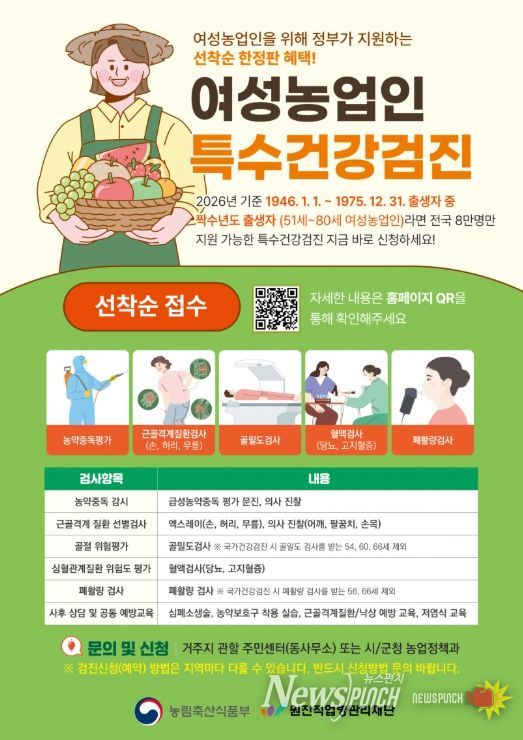검진 항목은 △근골격계 질환 △심혈관계 질환 △골절·낙상 위험 △농약 노출 관련 검사 △폐기능 검사 등으로 구성돼 있으며, 전문의 상담과 예방교육도 함께 제공된다.