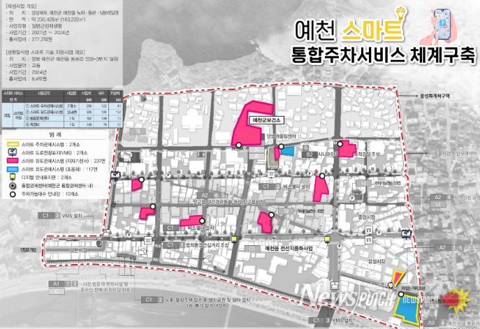 사업은 2024년 8.4억 원을 투입해 착수할 예정이며 스마트 주차관제시스템, 스마트 유도관제시스템, 스마트 관제센터 구축을 통해 읍내 공영주차장 10개소에 주차관제 및 유도관제시스템을 갖추고, 통합관제센터 및 예천군 스마트시티솔루션 확산사업과 연계해 사업효과를 극대화할 수 있을 것으로 기대된다.