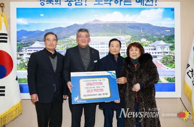 뉴스펀치 김수동 기자 | 예천군에서는 우진선박㈜ 정지원 대표가 지난 28일 (재)예천군민장학회를 방문해 지역인재 육성을 위한 장학금 1천만 원과 고향사랑기부금 5백만 원, 총 1천5백만 원을 전달했다.