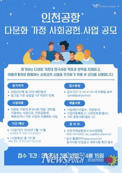 뉴스펀치 정홍균 기자 | 인천국제공항공사는 다문화 가정의 한국사회 정착을 위한 사회공헌 사업에 참여할 기업을 공모한다고 17일 밝혔다.