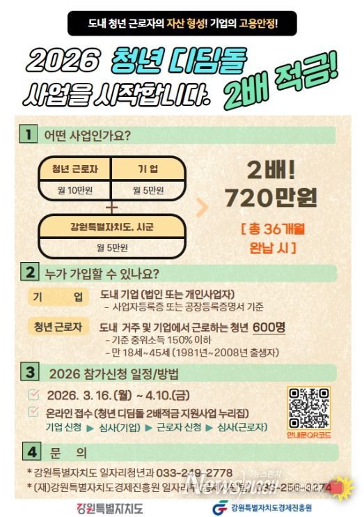 뉴스펀치 조평훈 기자 | 동해시는 청년 근로자의 자산 형성과 중소기업 장기 재직을 지원하기 위해 ‘2026년 청년 디딤돌 2배 적금 지원사업’ 참여자를 오는 4월 10일까지 모집한다고 밝혔다.