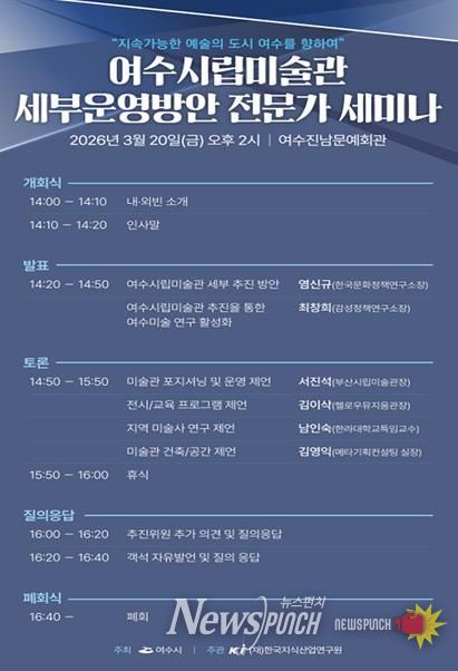 뉴스펀치 김용희 기자 | 여수시는 오는 3월 20일 오후 2시 진남문예회관에서 ‘여수시립미술관 건립 세부운영방안 전문가 토론회(세미나)’를 개최한다고 밝혔다.