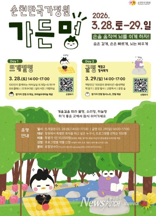 시 관계자는 “봄을 맞은 순천만국가정원에서는 이번 ‘가든멍’ 행사뿐만 아니라 4월 초 스페이스허브에서 ‘정원 봄꽃 피크닉’, 네덜란드 정원 일원에서 ‘국가정원 튤립 페스티벌’ 등 다양한 봄 프로그램이 이어질 예정이다”며 “올봄 정원에서 여유로운 봄소풍을 즐기시기 바란다”고 말했다.