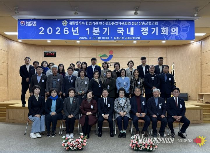 뉴스펀치 김용희 기자 | 민주평화통일자문회의 전남 장흥군협의회는 3월 10일 장흥군청 대회의실에서 노영환 장흥군부군수, 김종근 협의회장, 자문위원 35명이 참석한 가운데 "2026년 1분기 국내 정기회의"를 개최했다.