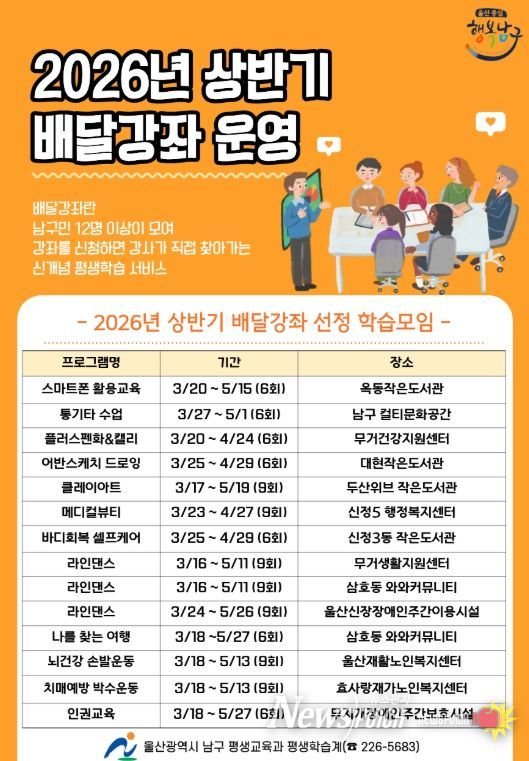 뉴스펀치 김윤걸 기자 | 울산 남구는 지역 주민이 원하는 시간과 장소에서 배움을 이어갈 수 있는 수요자 중심 평생학습 프로그램‘2026년 상반기 맞춤형 배달강좌’를 운영한다고 17일 밝혔다.