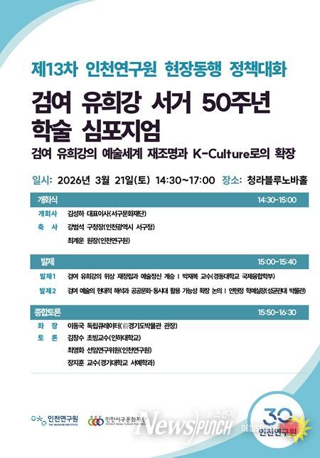 뉴스펀치 정홍균 기자 | 인천연구원은 2026년 3월 21일 오후 2시 30분, 청라블루노바홀에서 “검여 유희강의 예술세계 재조명과 K-Culture로의 확장”을 주제로 '제13차 현장동행 정책대화'를 개최한다.