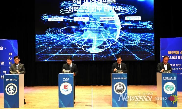 뉴스펀치 정홍균 기자 | 부안군은 18일 부안예술회관에서 열린 부안형 신바람 기본사회 비전 선포식에서 전북특별자치도, 전북자동차고등학교, 한국해상풍력(주)와 함께 전북 서남권 해상풍력 지역 상생 업무협약을 체결했다고 밝혔다.