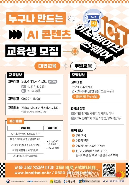 뉴스펀치 김용희 기자 | 광양시는 3월 16일부터 4월 8일까지 ‘누구나 만드는 AI 콘텐츠’ 교육생을 모집한다고 밝혔다.