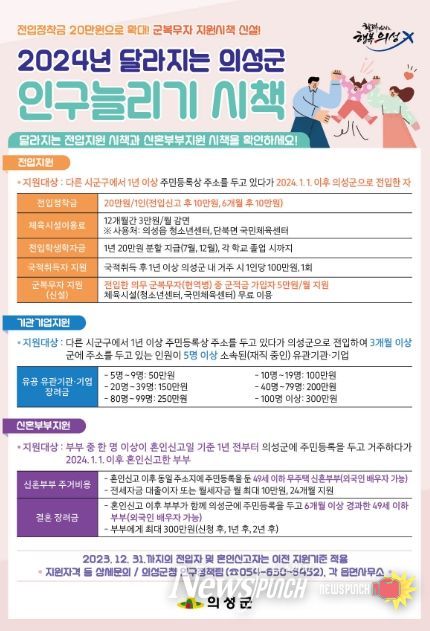 뉴스펀치 김수동 기자 | 의성군은 유입 인구를 늘리고 전입인구의 정착을 도모하기 위해 2024년 새해부터 개정된 의성군 인구늘리기 지원 조례를 시행할 예정이라고 밝혔다.