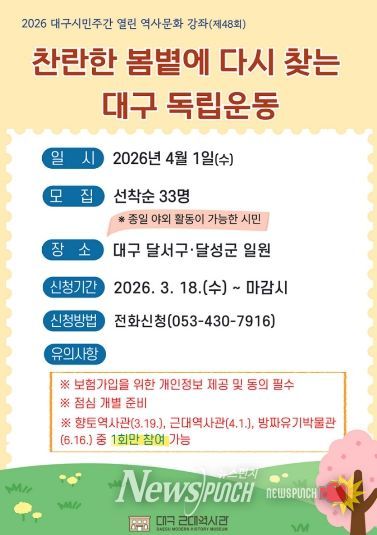 뉴스펀치 조평훈 기자 | (재)대구문화예술진흥원 박물관운영본부 소속 대구근대역사관은 2026 대구시민주간 연계행사로 4월 1일 대구시 달서구와 달성군 일원의 대구 독립운동가와 문화유산을 찾아보는 ‘찬란한 봄볕에 다시 찾는 대구 독립운동’ 답사를 개최하며, 참가자를 모집한다.