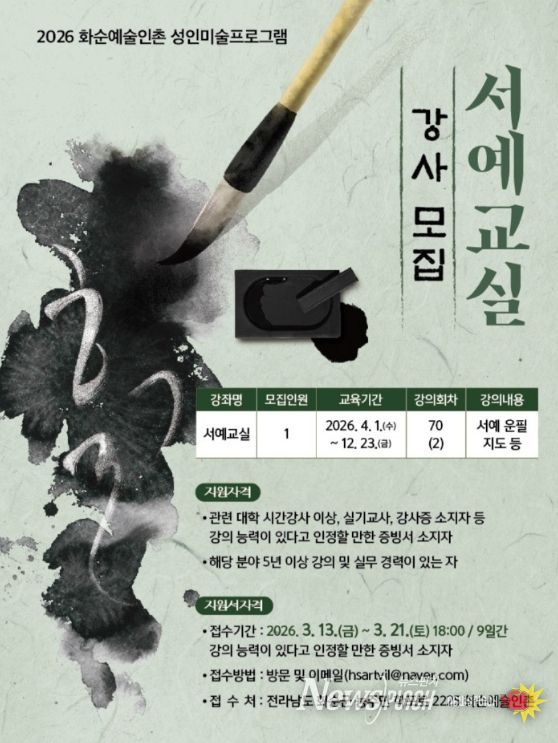 뉴스펀치 김용희 기자 | 화순군은 18일 화순예술인촌에서 운영하는 서예교실 강사를 공개모집한다고 밝혔다.