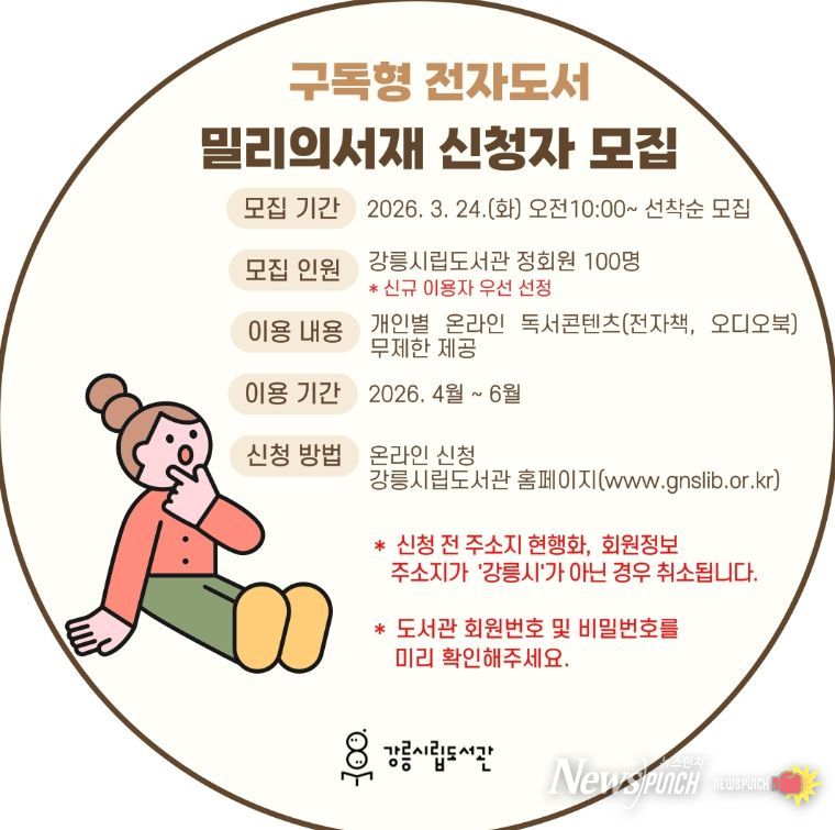 뉴스펀치 조평훈 기자 | 강릉시립도서관은 시민들의 독서 접근성을 높이고 다양한 독서 기회를 제공하기 위해 구독형 전자도서 서비스 ‘밀리의 서재’ 2분기 이용자 100명을 선착순으로 모집한다.