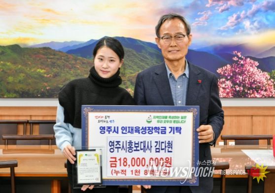 영주시인재육성장학회 박남서 이사장은 “어려운 여건 속에서도 인재육성을 위해 ‘영주사랑’을 전해준 김다현 양에게 깊은 감사를 드린다”며 “이 장학금이 청소년들의 꿈의 자양분이 되도록 노력하겠다”고 말했다.
