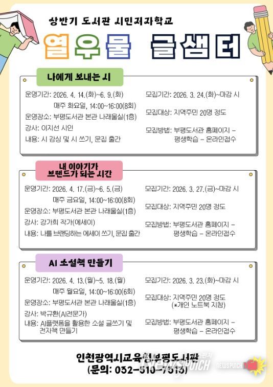 뉴스펀치 정홍균 기자 | 인천광역시교육청부평도서관은 시민에게 다채로운 글쓰기 경험을 제공하고 예비 작가로서의 성장을 지원하기 위해, 상반기 시민 저자 학교 ‘열우물 글샘터’를 운영한다.