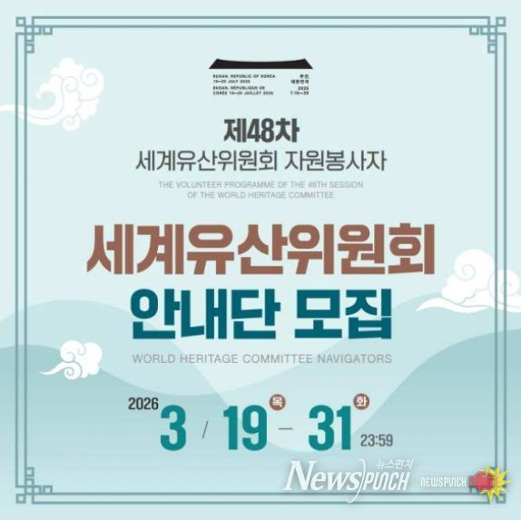 뉴스펀치 정홍균 기자 | 국가유산청 제48차 세계유산위원회 회의 준비기획단은 7월 부산에서 개최되는 제48차 유네스코 세계유산위원회 회의(48th Session of the World Heritage Committee)에 국내·외 청년들의 국제회의 현장 참여 기회를 제공하기 위하여 '세계유산위원회 안내단(World Heritage Committee Navigators)'의 참가자를 공개 모집한다.