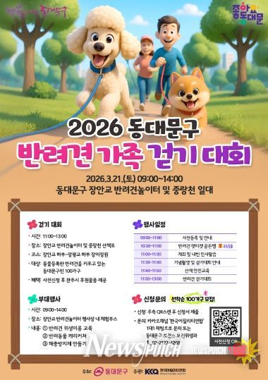 뉴스펀치 박상훈 기자 | 서울 동대문구는 오는 21일 중랑천 장안교 하부 반려견 놀이터와 산책로 일대에서 ‘2026 동대문구 반려견 가족 걷기대회’를 연다고 밝혔다.