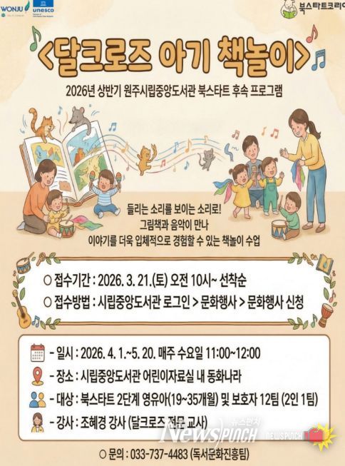 뉴스펀치 조평훈 기자 | 원주시립중앙도서관은 유아의 오감 및 정서 발달을 돕기 위해 2026년 상반기 북스타트 후속 프로그램 ‘달크로즈 아기 책놀이’를 운영한다.