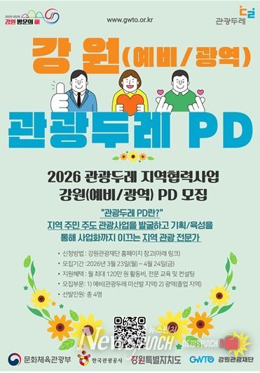 뉴스펀치 조평훈 기자 | 강원특별자치도와 강원관광재단은 지역관광 활성화를 위한 '2026 관광두레 지역협력사업'의 일환으로 ‘강원 PD(예비·광역)’를 공개 모집한다고 밝혔다.