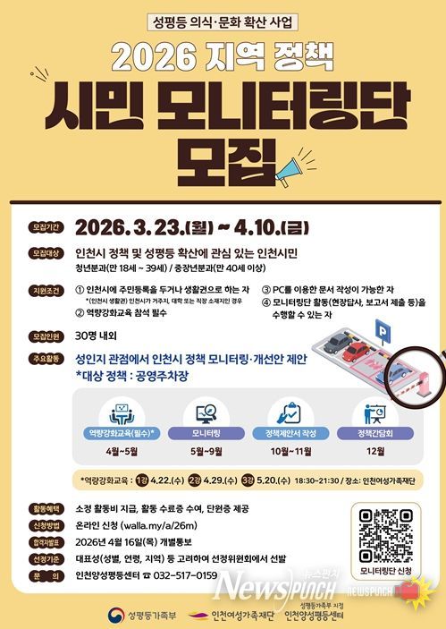 뉴스펀치 정홍균 기자 | (재)인천광역시여성가족재단 인천양성평등센터'지역 정책 모니터링단'은 시민이 인천광역시의 정책이나 사업을 성인지 관점에서 점검하고 개선 방안을 제안하는 사업이다.