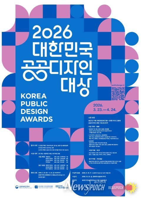 뉴스펀치 정홍균 기자 | 문화체육관광부는 한국공예‧디자인문화진흥원과 함께 3월 23일부터 4월 24일까지 ‘2026 대한민국 공공디자인대상’을 공모한다. 19회를 맞이한 이번 공모에서는 공공디자인을 통해 국민의 일상을 아름답고 편리하게 조성하는 데 기여한 우수사업과 연구 총 17점을 선정한다.