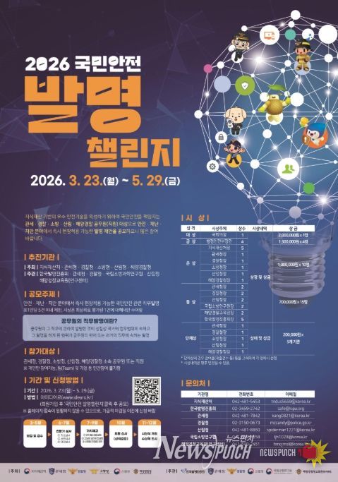뉴스펀치 정홍균 기자 | 지식재산처는 관세청, 경찰청, 소방청, 산림청, 해양경찰청과 함께 '2026 국민안전 발명챌린지' 접수를 3월 23일부터 5월 29일까지 진행한다고 밝혔다.