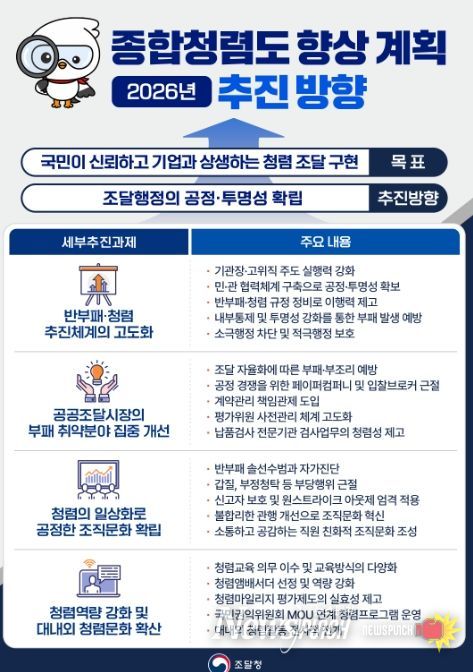 뉴스펀치 정홍균 기자 | 조달청은 공공조달 전 과정의 공정성과 투명성을 한층 더 강화하고 국민이 신뢰할 수 있는 조달행정을 구현하기 위해 '2026년도 종합청렴도 향상 추진계획'을 확정하고 본격 시행에 나선다.