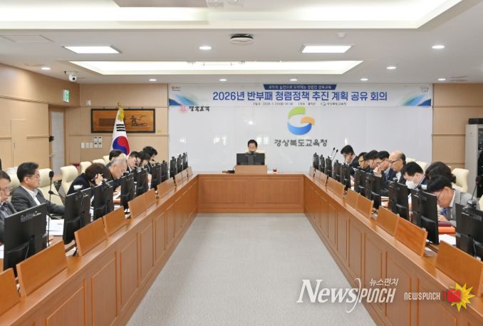 뉴스펀치 박세훈 기자 | 경북교육청은 23일 본청 홍익관에서 교육감 주재로 부교육감을 비롯한 본청 간부 22명이 참석한 가운데 ‘2026년 반부패 청렴정책 추진 계획 공유 회의’를 개최하고, 청렴도 향상을 위한 정책 실행을 본격화했다고 밝혔다.