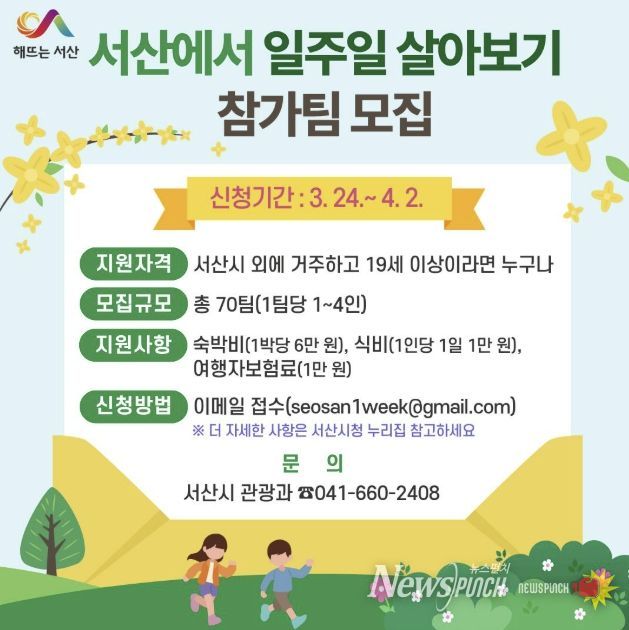 뉴스펀치 이현승 기자 | 충남 서산시가 3월 24일부터 4월 2일까지 ‘서산에서 일주일 살아보기’ 참가팀을 모집한다고 밝혔다.