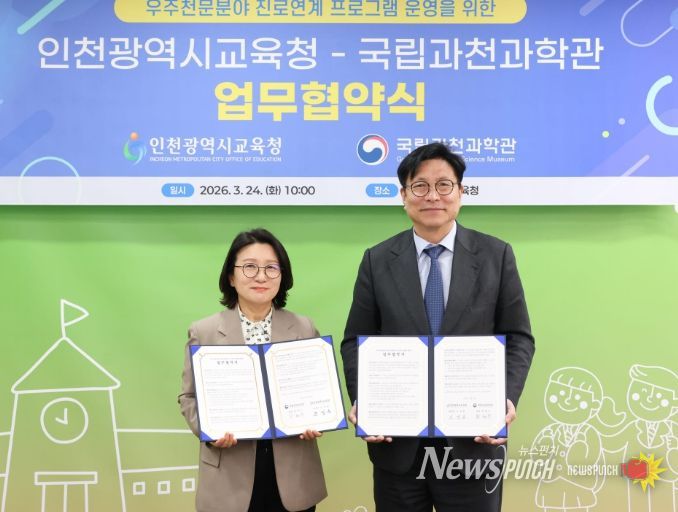 뉴스펀치 정홍균 기자 | 인천광역시교육청은 24일 국립과천과학관과 우주천문 분야 진로연계 프로그램 운영을 위한 업무협약을 체결하고 미래 우주 시대를 이끌어갈 창의적인 인재 양성에 나섰다.